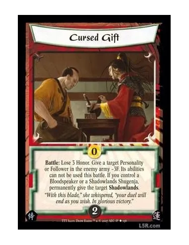Battle: Lose 3 Honor. Give a target Personality or Follower in the enemy army -3F. Its abilities can not be used this battle. If you control a Bloodspeaker or a Shadowlands Shugenja, permanently give the target Shadowlands.