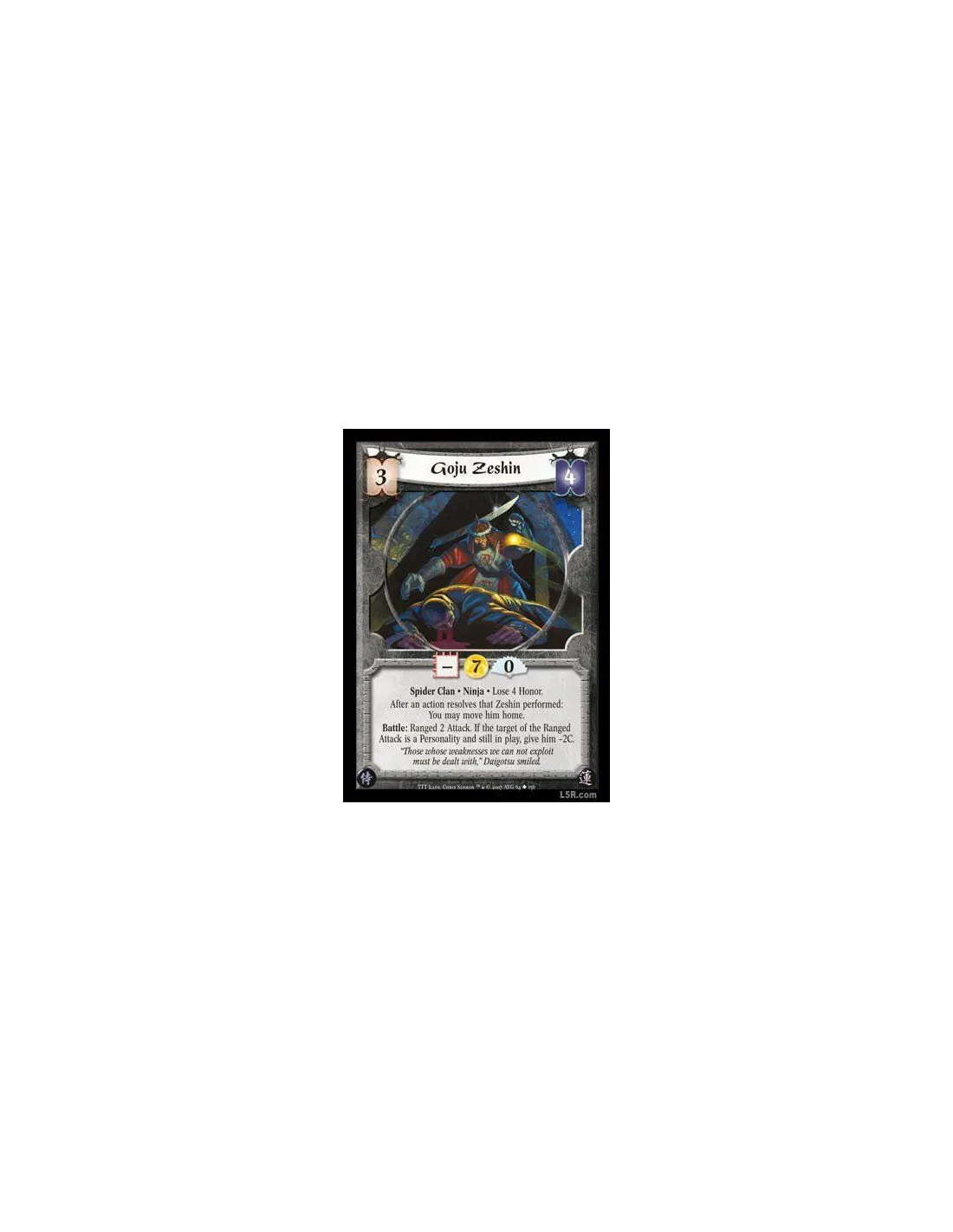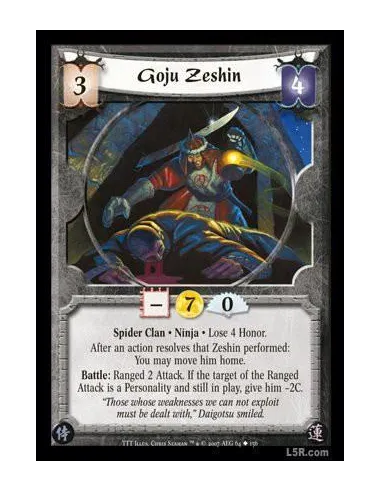 Spider Clan · Ninja · Lose 4 Honor. After an action resolves that Zeshin performed: You may move him home. Battle: Ranged 2 Attack. If the target of the Ranged Attack is a Personality and still in play, give him -2C.