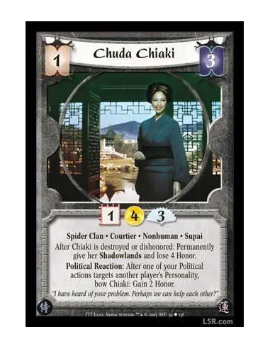 Spider Clan · Courtier · Nonhuman · Supai. After Chiaki is destroyed or dishonored: Permanently give her Shadowlands and lose 4 Honor. Political Reaction: After one of your Political actions targets another player's Personality, bow Chiaki: Gain 2 Honor