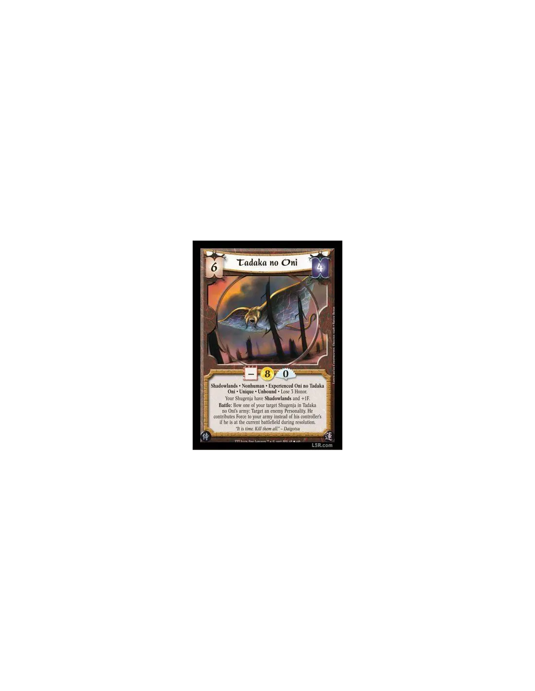 Shadowlands · Nonhuman · Experienced Oni no Tadaka · Oni · Unique · Unbound · Lose 3 Honor. Your Shugenja have Shadowlands and +1F. Battle: Bow one of you target Shugenja in Tadaka no Oni's army: Target an enemy Personality: He contributes Force to your army instead of his controller´s if he is at the current battlefield during resolution.