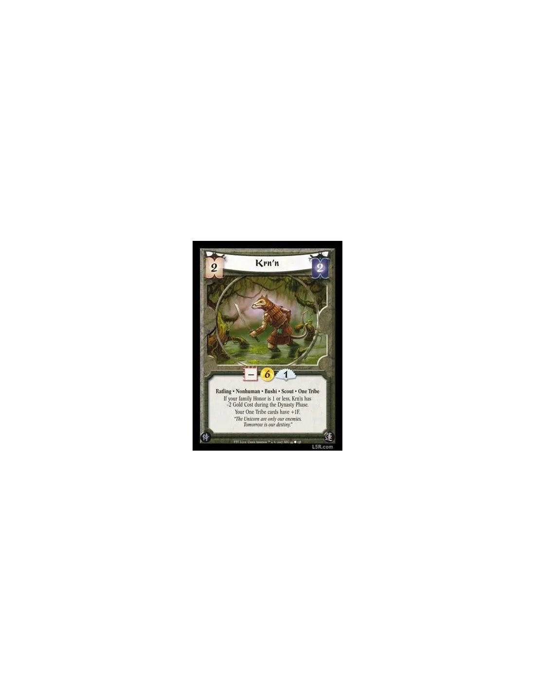 Ratling · Nonhuman · Bushi · Scout · One Tribe. If your family Honor is 1 or less, Krn?n has -2 Gold Cost during the Dynasty Phase. Your One Tribe cards have +1F