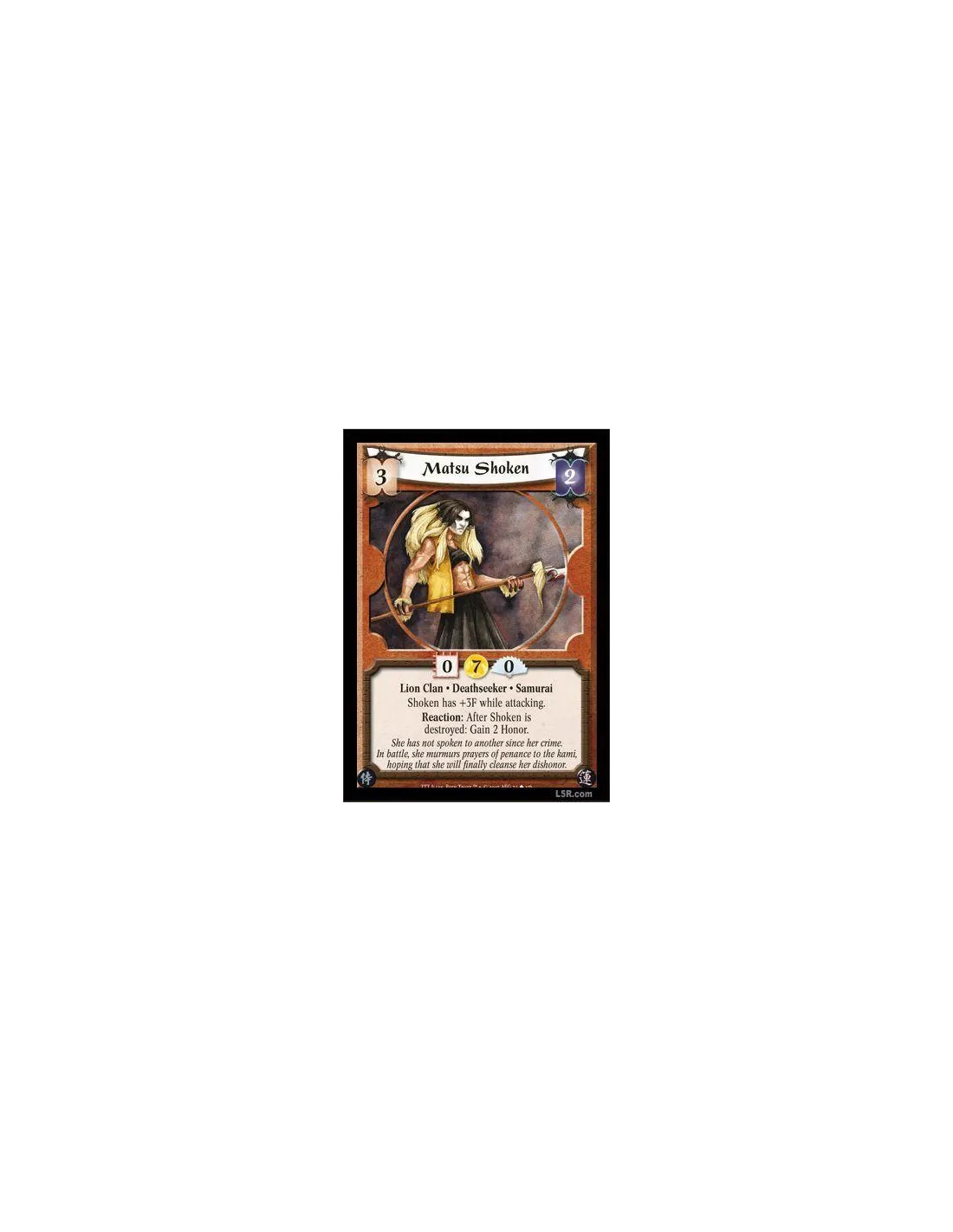 Lion Clan · Deathseeker · Samurai. Shoken has +3F while attacking. Reaction: After Shoken is destroyed: Gain 2 Honor.