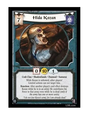 Crab Clan · Shadowlands · Damned · Samurai. While Kozan is unbowed, other players' Limited actions can not target him. Reaction: After another player's card effect destroys Kozan while he is in an army: He contributes his Force to that army even while he is dead. (Only if the army has one or more units)