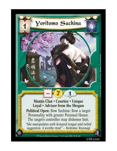 Mantis Clan · Courtier · Unique · Loyal · Advisor from the Shogun. Political Open: Bow Sachina: Bow a target Personality with greater Personal Honor. The target's controller may dishonor him