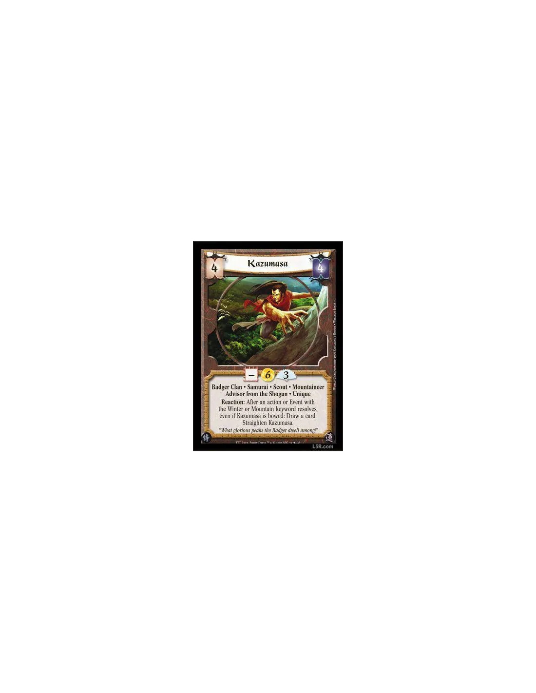 Badger Clan · Samurai · Scout · Mountaineer · Advisor from the Shogun · Unique. Reaction: After an Action or Event with the Winter or Mountain keyword resolves, even if Kazumasa is bowed: Draw a card. Straighten Kazumasa.