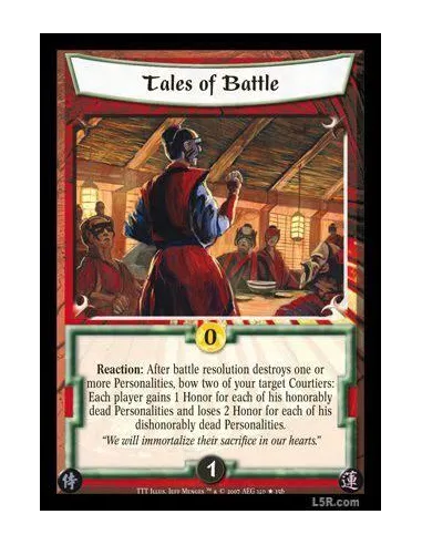 Reaction: After battle resolution destroys one or more Personalities, bow two of your target Courtiers: Each player gains 1 Honor for each of his honorably dead Personalities and loses 2 Honor for each of his dishonorably dead Personalities
