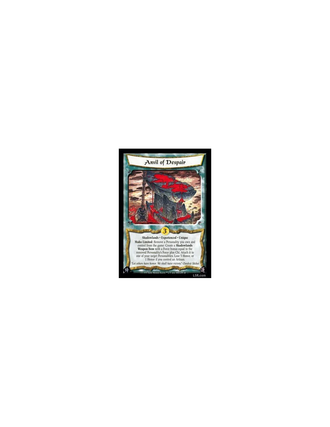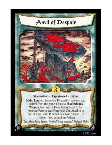 Shadowlands · Experienced · Unique. Maho Limited: Remove a Personality you own and control from the game: Create a Shadowlands Weapon Item with Force bonus equal to the removed Personality's Force plus Chi. Attach it to one of your target Personalities. Lose 5 Honor, or 1 Honor if you control an Artisan.