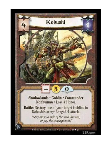 Shadowlands · Goblin · Commander · Nonhuman · Lose 4 Honor. Battle: Destroy one of your target Goblins in Kobushi's army: Ranged 5 Attack