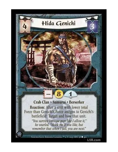Crab Clan · Samurai · Berserker. Reaction: After a unit with lower total Force than Genichi's Force assigns Genichi's battlefield: Target and bow that unit.