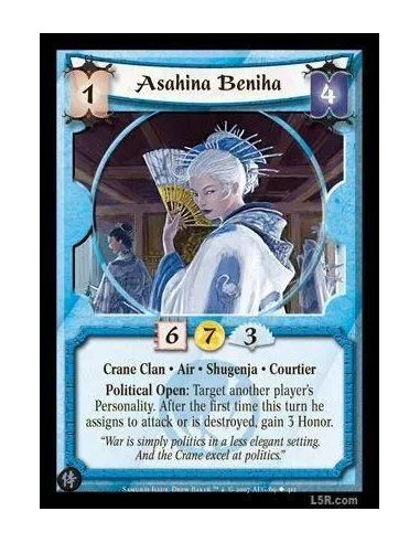 Crane Clan · Air · Shugenja · Courtier. Political Open: Target another player's personality. After the first time this turn he assigns to attack you or is destroyed, gain 3 Honor.