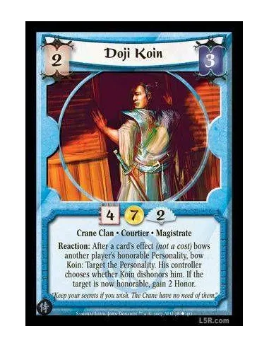 Crane Clan · Courtier · Magistrate. Reaction: After a card's effect (not a cost) bows another player's personality, bow Koin: Target the personality. His controller chooses whether Koin dishonors him. If the target is now honorable, gain 2 Honor