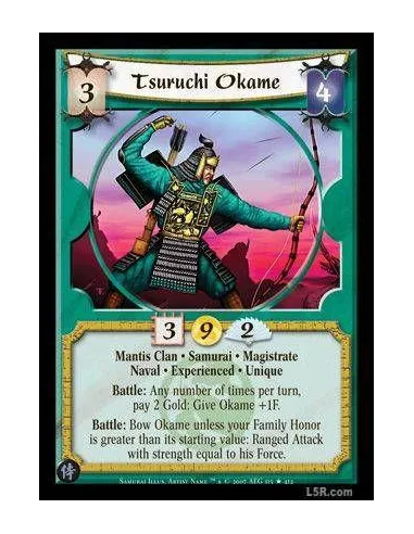 Mantis Clan · Samurai · Magistrate · Naval · Experienced · Unique. Battle: Any number of times per turn, pay 2 Gold: Give Okame +1F. Battle: Bow Okame unless your Family Honor is greater than its starting value: Ranged Attack with strength equal to his Force