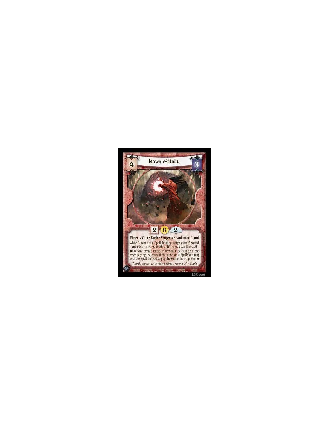 Phoenix Clan · Earth · Shugenja · Avalanche Guard. While Eitoku has a Spell, he may assign even if bowed, and adds his Force to his unit's Force even if bowed. Reaction: Even if Eitoku is bowed, if he is in an army, when paying the costs of an action on a Spell: You may bow the Spell instead to pay the cost of bowing Eitoku.