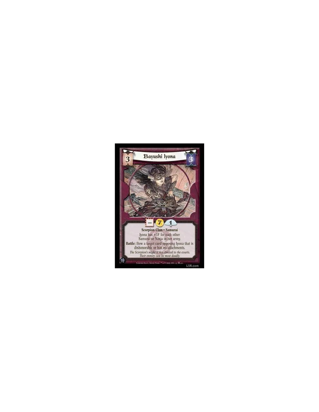 Scorpion Clan · Samurai. Iyona has +1F for each other Samurai or Ninja in her army. Battle: Bow a target card opposing Iyona that is dishonorable or has no attachments.