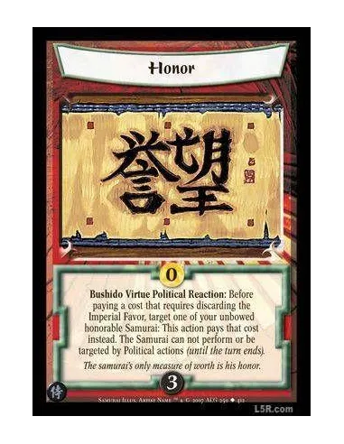 Bushido Virtue Open: Target one of your Samurai: Gain 1 Honor, or gain Honor equal to his base Personal Honor if your Family Honor is 9 or less. Bushido Virtue Battle/Open: Target one of your honorable Samurai: After this phase ends, straighten him if he performed no Political actions during it.