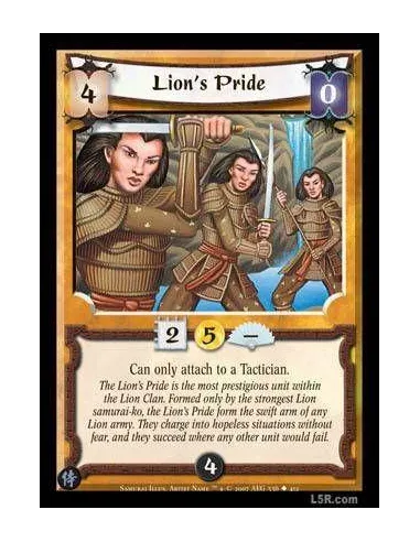 The Lion's Pride is the most prestigious unit within the Lion Clan. Formed only by the strongest Lion samurai-ko, the Lion's Pride form the swift arm of any Lion army. They charge into hopeless situations without fear, and they succeed where any other uni