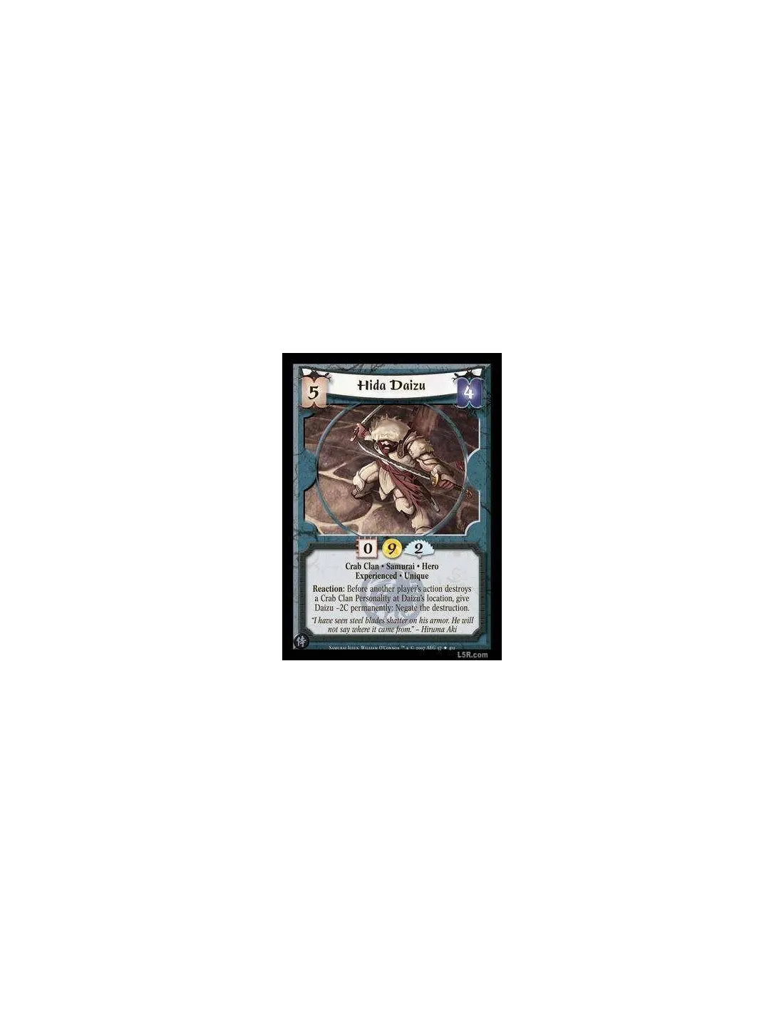Crab Clan · Samurai · Hero · Experienced · Unique. Reaction: Before another player's action destroys a Crab Clan Personality at Daizu's localization, give Daizu -2C permanently: Negate the destruction