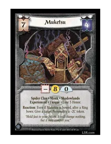 Spider Clan · Monk · Shadowlands · Experienced · Unique. Lose 5 Honor. Reaction: Even if Muketsu is bowed, after a Ring bows: Give a target Personality a ?2C token.