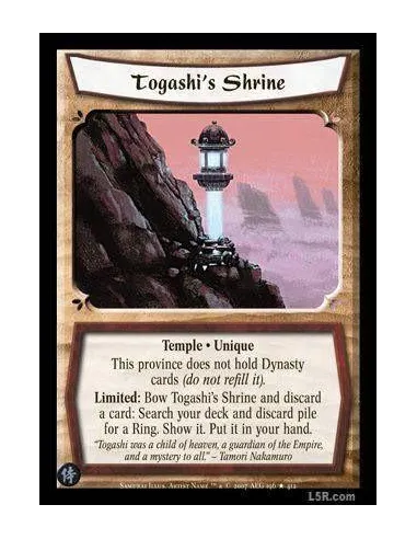 Temple · Unique This province does not hold Dinasty card (do not refill it) Limited: Bow Togashi's Shrine and discard a card: Search your deck and discard pile for a ring. Show it. Put it in your hand.
