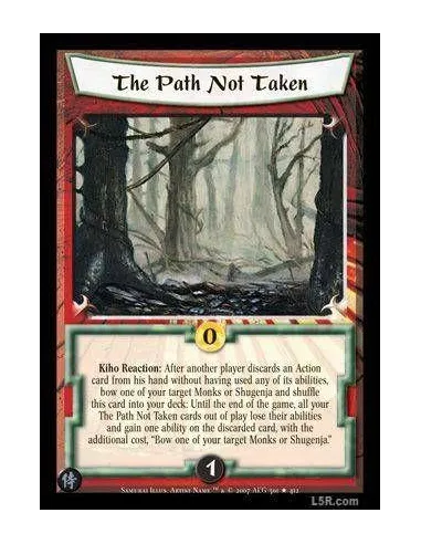 Kiho Reaction : After another player discards an Action card from his hand without having used any of its abilities, bow one of your target Monks or Shugenja and shuffle this card into your deck: Until the end of the game, all your The Path Not Taken cards out of play lose their abilities and gain one ability on the discarded card, with the additional cost, "Bow one of your target Monks or Shugenja."