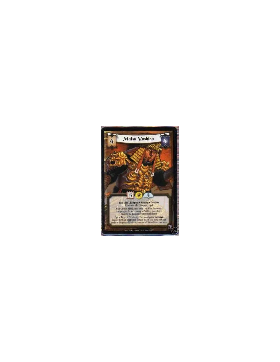 Lion Clan · Clan Champion · Samurai · Tactician · Hero · Experienced 2 · Unique · Loyal. Your Lion Clan attacking personalities at Yoshino's location have a force bonus equal to their personal honor. Tactical Battle: Destroy a target personality without attachment. You may then target and destroy an attachment.