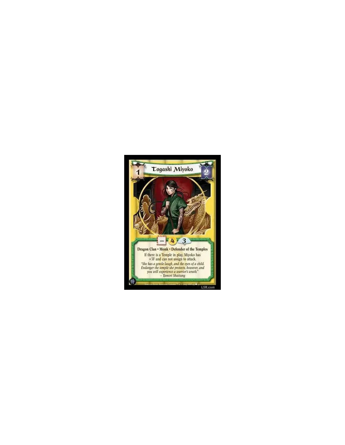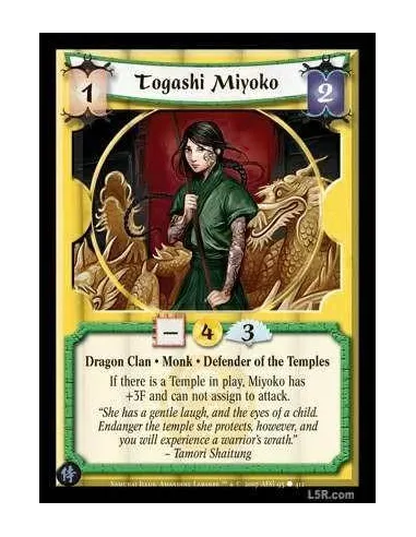 Dragon Clan · Monk · Defender of the Temples If there is a Temple in play, Miyoko has +3F and cannot assign to attack.