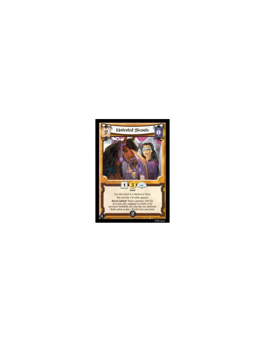 Scout Can only attach to a Samurai or Scout. This card has +1F while opposed. Recon Limited : Target a province. Until the turn ends, after engaging in a battle at the province's battlefield, you may take on additional Battle action to play a Terrain from your hand.