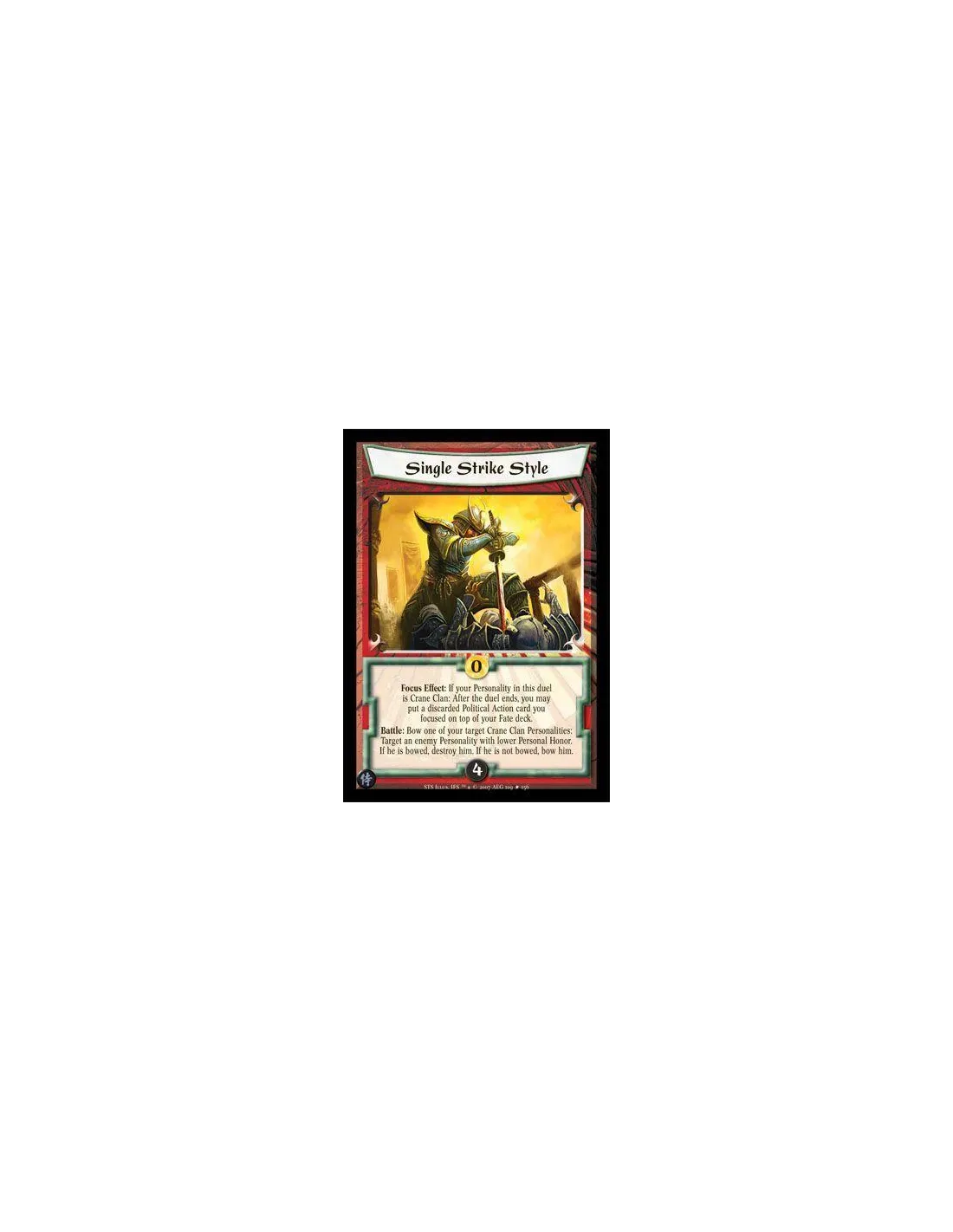 Focus Effect: If your Personality in this duel is Crane Clan: After the duel ends, you may put a discarded Political Action card you focused on top of your Fate deck. Battle: Bow one of your target Crane Clan Personalities: Target an enemy Personality with lower Personal Honor. If he is bowed, destroy him. If he es not bowed, bow him.
