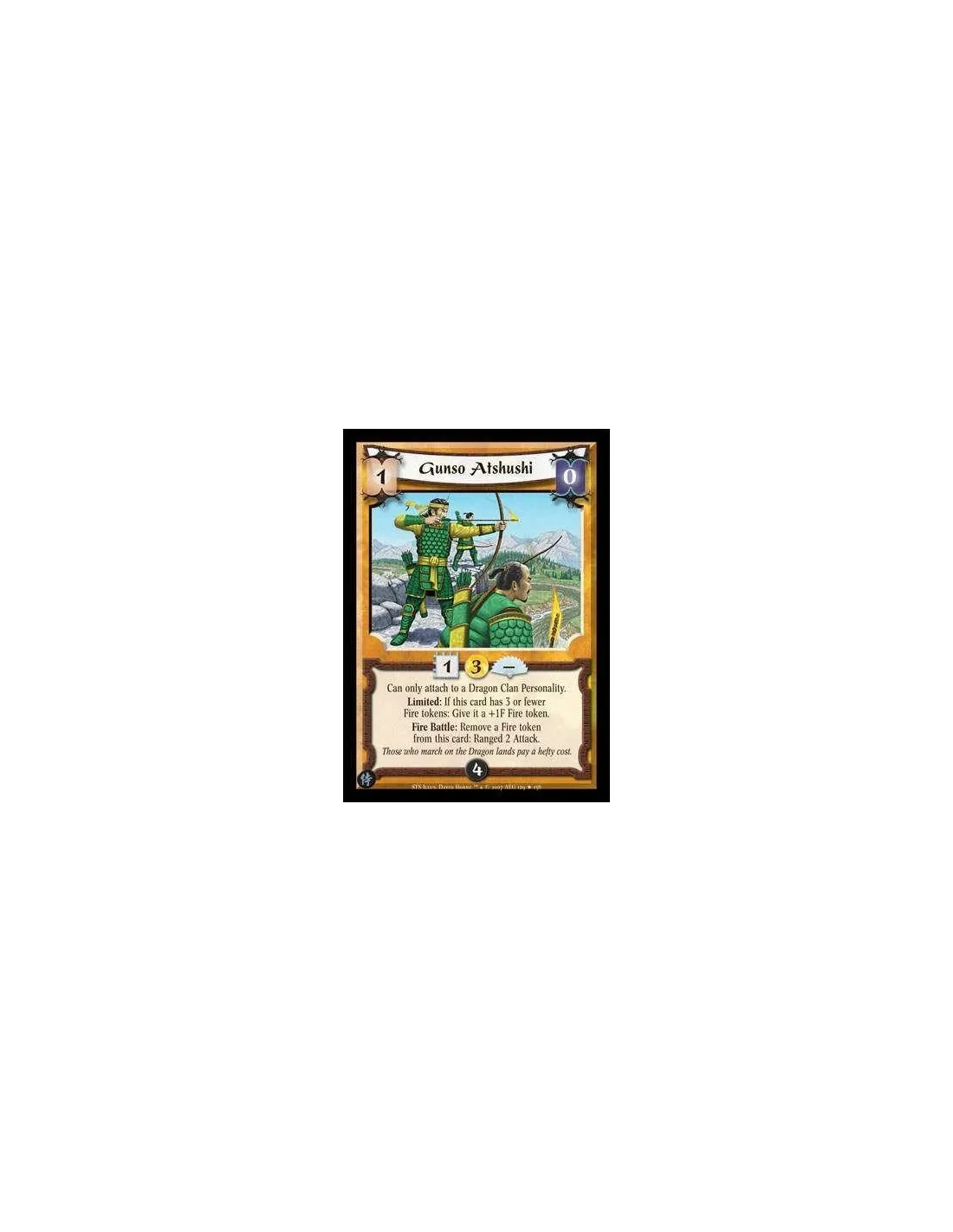 Can only attach to a Dragon Clan Personality. Limited: if this card has 3 or fewer Fire tokens: give if a +1F Fire token. Fire Battle: Remove a Fire token from this card: Ranged 2 Attack.