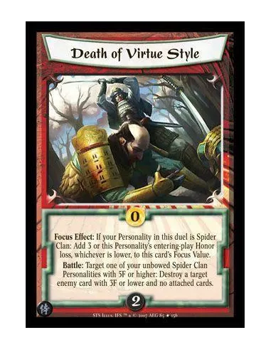 Focus Effect: if your Personality in this duel is Spider Clan: Add 3 or this Personality´s entering-play Honor loss, wichever is lower, to this card's Focus Value. Battle: Target one of your unbowed Spider Clan Personalities with 5F or higher: Destroy a target enemy card with 3F or lower and no attached cards.