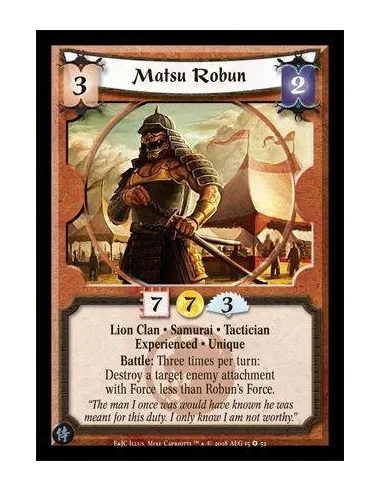 Lion Clan • Samurai • Tactician Experienced • Unique Battle: Three times per turn: Destroy a target attachment in the enemy army with Force less than Robun’s Force.