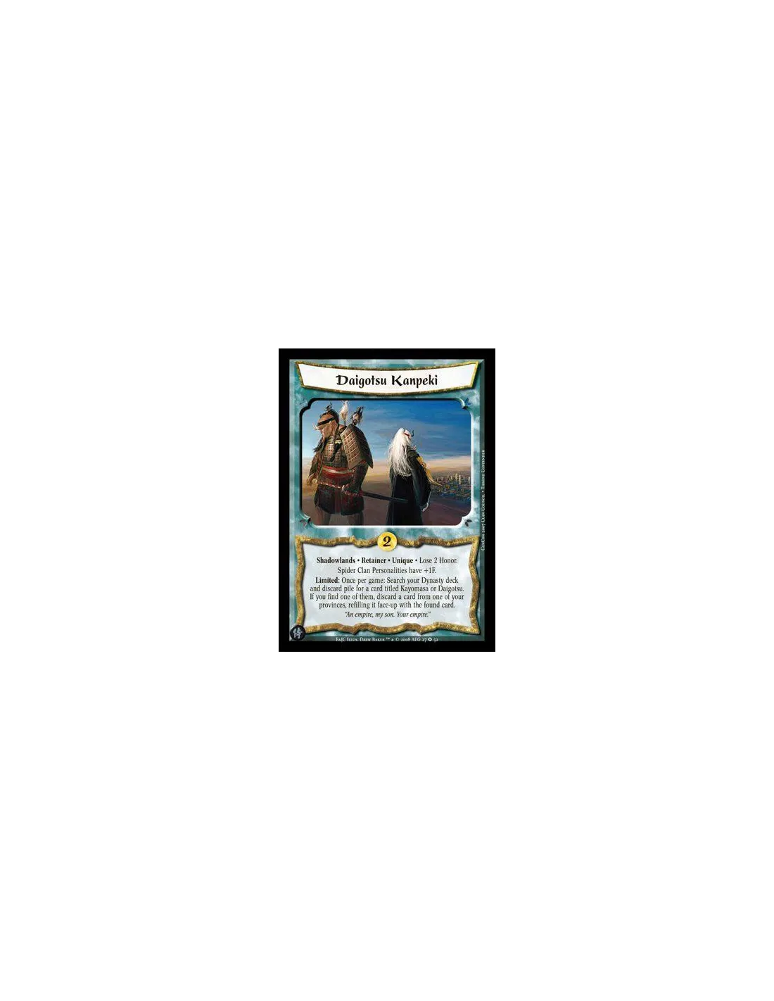 Shadowlands • Unique • Retainer • Lose 2 Honor. Spider Clan Personalities have +1F. Limited: Once per game, bow this card: Search your Dynasty deck and discard pile for a card titled Kayomasa or Daigotsu. If you find one of them, discard a card from one of your Provinces, refilling it with the found card.