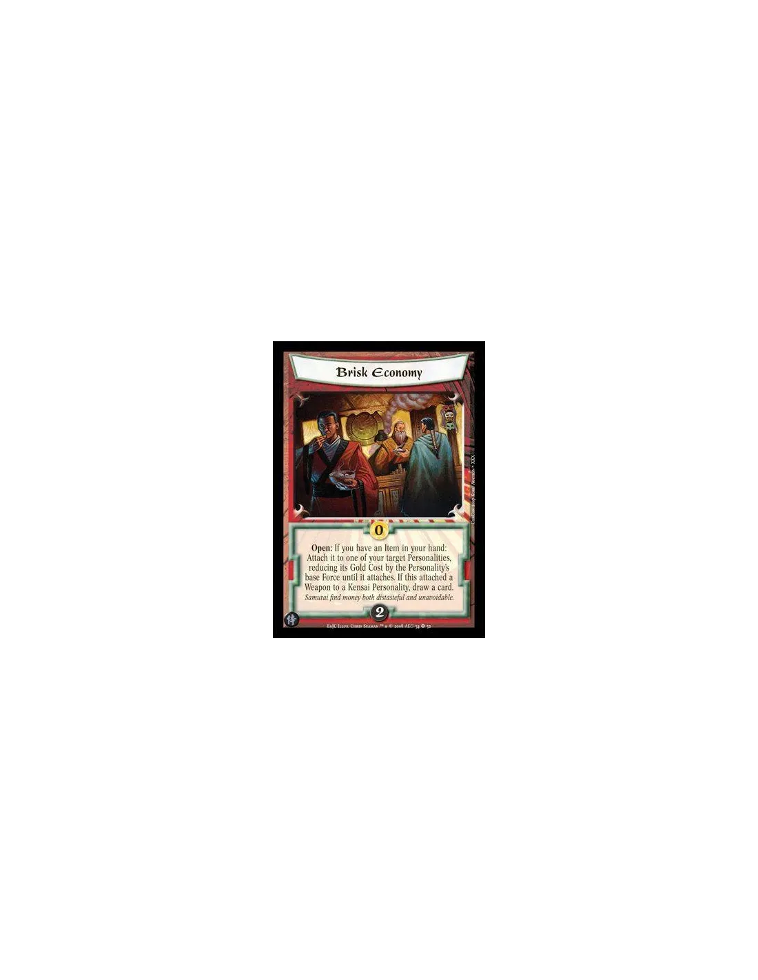 Open: If you have an Item in your hand:Attach it to one of your target Personalities,reducing its Gold Cost by the Personality’sbase Force until it attaches. If this attached aWeapon to a Kensai personality, draw a card.