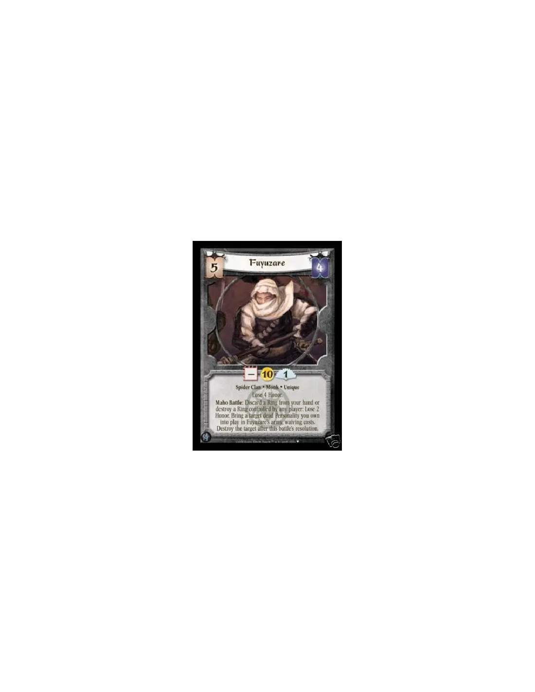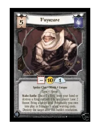 Spider Clan • Monk • Unique Lose 4 Honor. Maho Battle: Discard a Ring from your hand or destroy a Ring controlled by any player: Lose 2 Honor. Bring a target Dead Personality you own into play in Fuyuzare's army, waiving costs. Destroy the target after this battle's resolution.