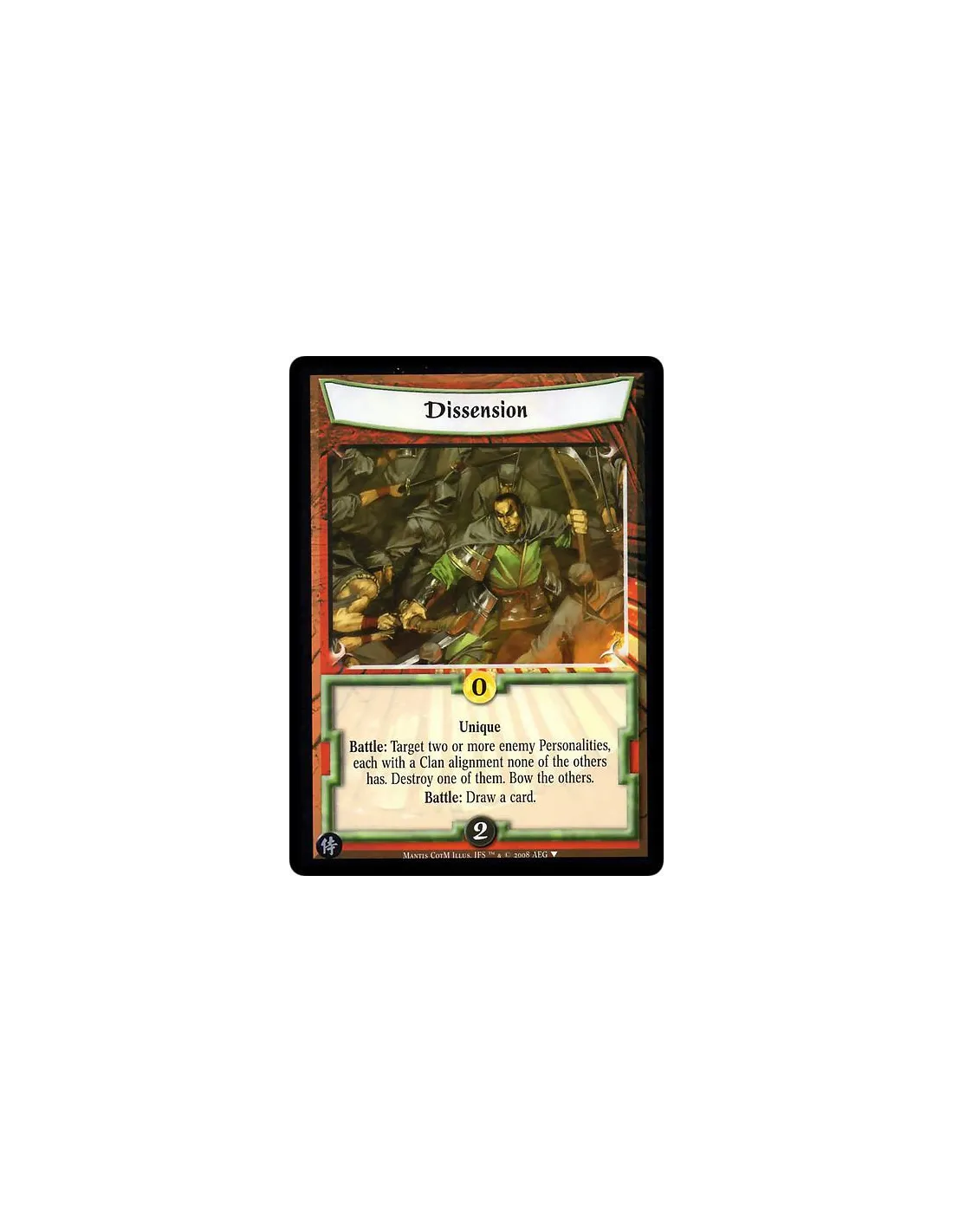 Unique Battle: Target two or more enemy Personalities, each with a Clan alignment none of the others has. Destroy one of them. Bow the others. Battle: Draw a card.