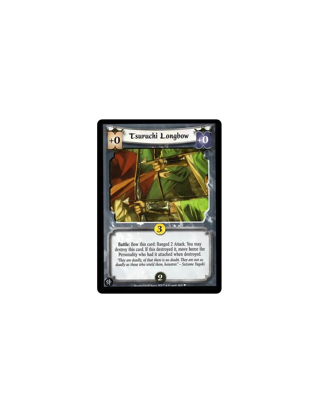 Battle: Bow this card: Ranged 2 Attack. You may destroy this card. If this destroyed it, move home the Personality who had it attached when destroyed.