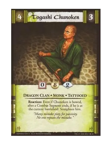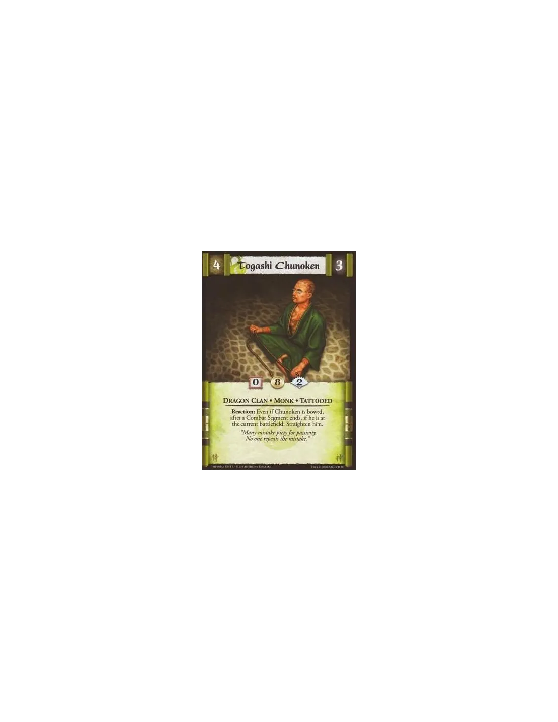 Dragon Clan * Monk * Tattooed Reaction: After a Combat Segment ends, even if Chunoken is bowed, if he is at the current battlefield: Straighten him.