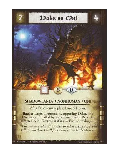 Shadowlands * Oni * Nonhuman After Daku no Oni enters play: Lose 6 Honor. Battle: Bow a target Personality opposing Daku no Oni, or bow one of the enemy leader’s target Holdings. Destroy the targeted card if it is a Farm or Ashigaru.