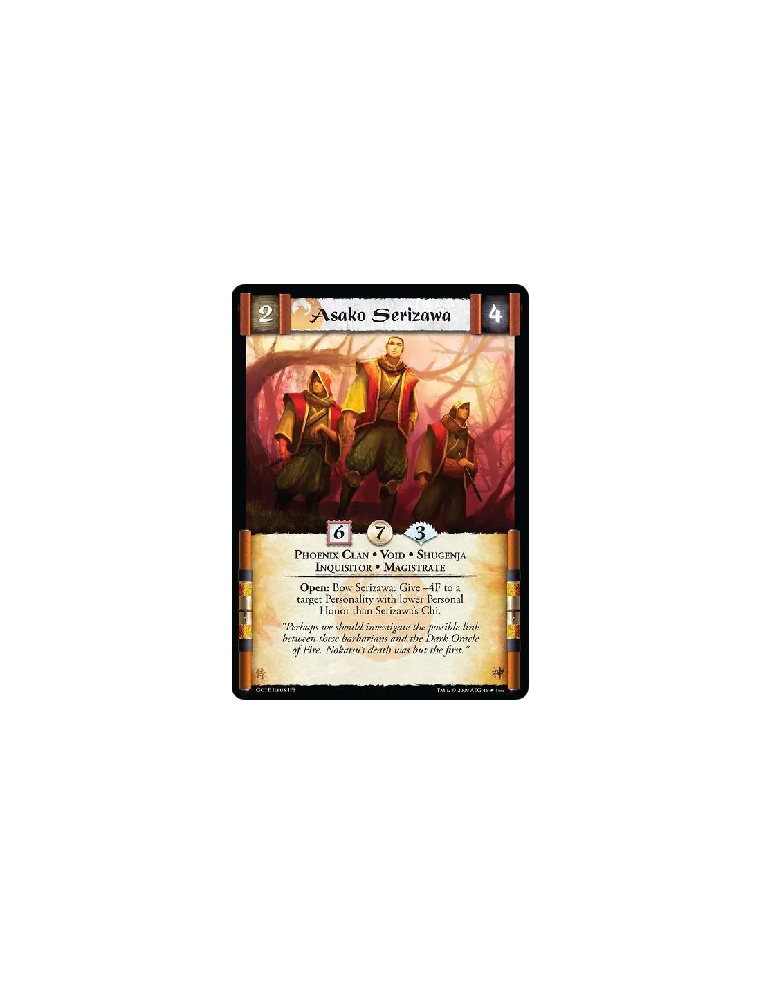 Phoenix Clan • Void • Shugenja • Inquisitor • Magistrate. Open: Bow Serizawa: Give -4F to a target Personality with lower Personal Honor than Serizawa’s Chi