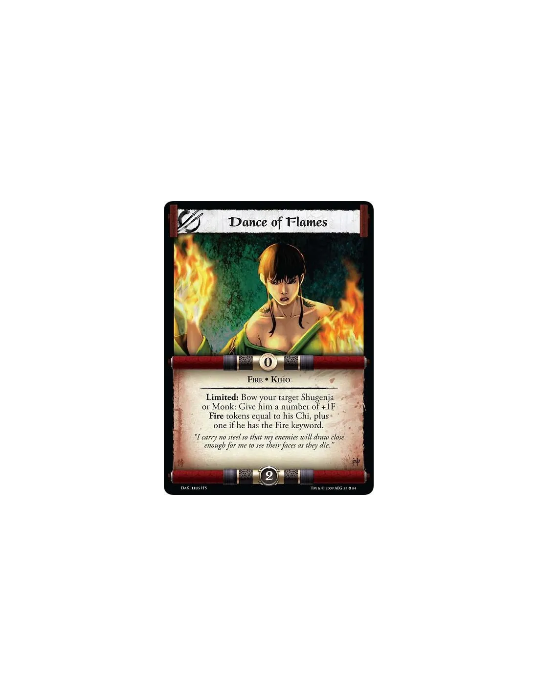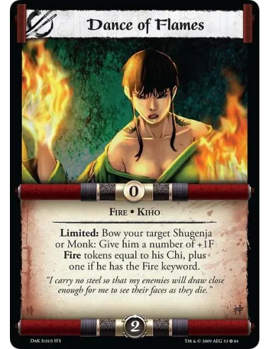 Fire • Kiho Limited: Bow your target Shugenja or Monk: Give him a number of +1F Fire Tokens equal to his Chi, plus one if he has the Fire keyword.