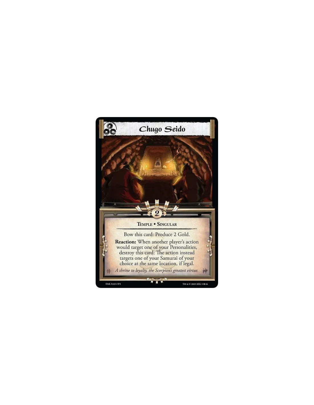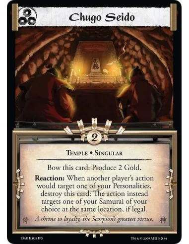 Temple • Singular Bow this Card: Produce 2 Gold Reaction: When another player's action would target one of your personalities, destroy this card: The action instead targets one of your Samurai of your choice at the same location, if legal.
