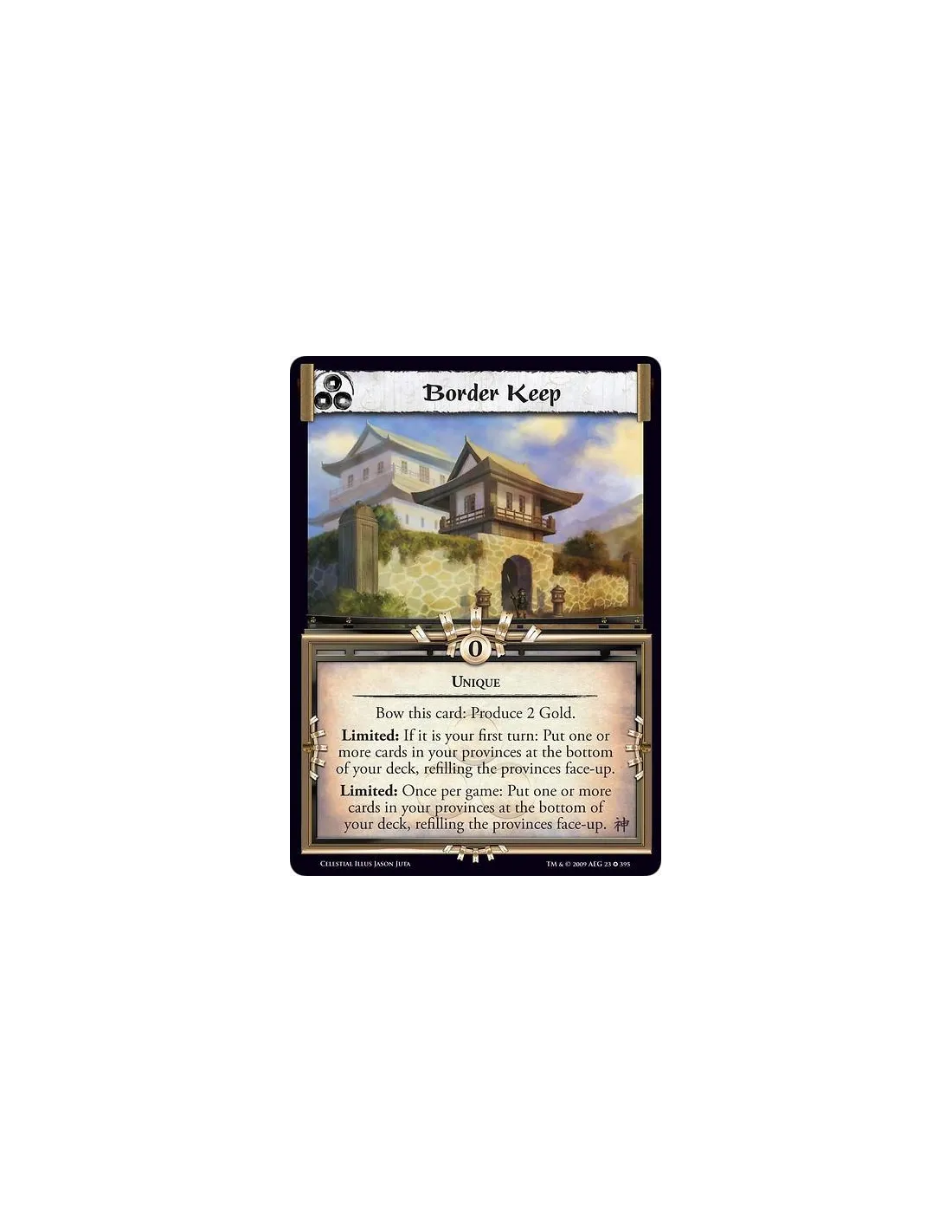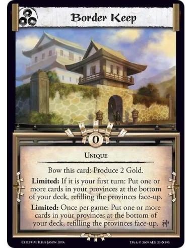 Unique Bow this card: Produce 2 Gold. Limited: If it is your first turn: Put one or more cards in your provinces at the bottom of your deck, refilling the provinces face-up. Limited: Once per game: Put one or more cards in your provinces at the bottom of your deck, refilling the provinces face-up.