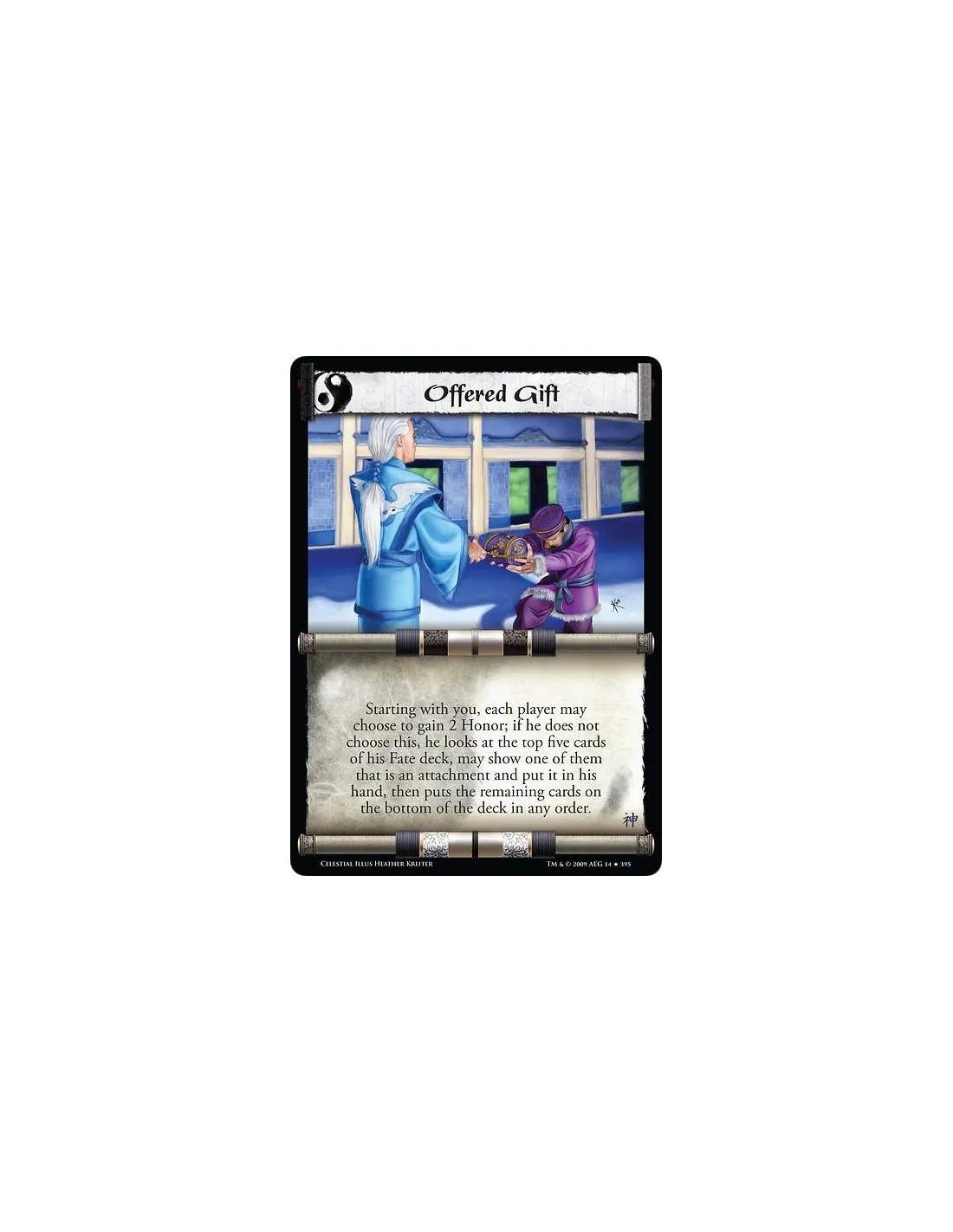 Starting with you, each player may choose to gain 2 Honor; if he does not choose this, he looks at the top five cards of his Fate deck, may show one of them that is an attachment and put it in his hand, then puts the remaining cards on the bottom of the deck in any order.
