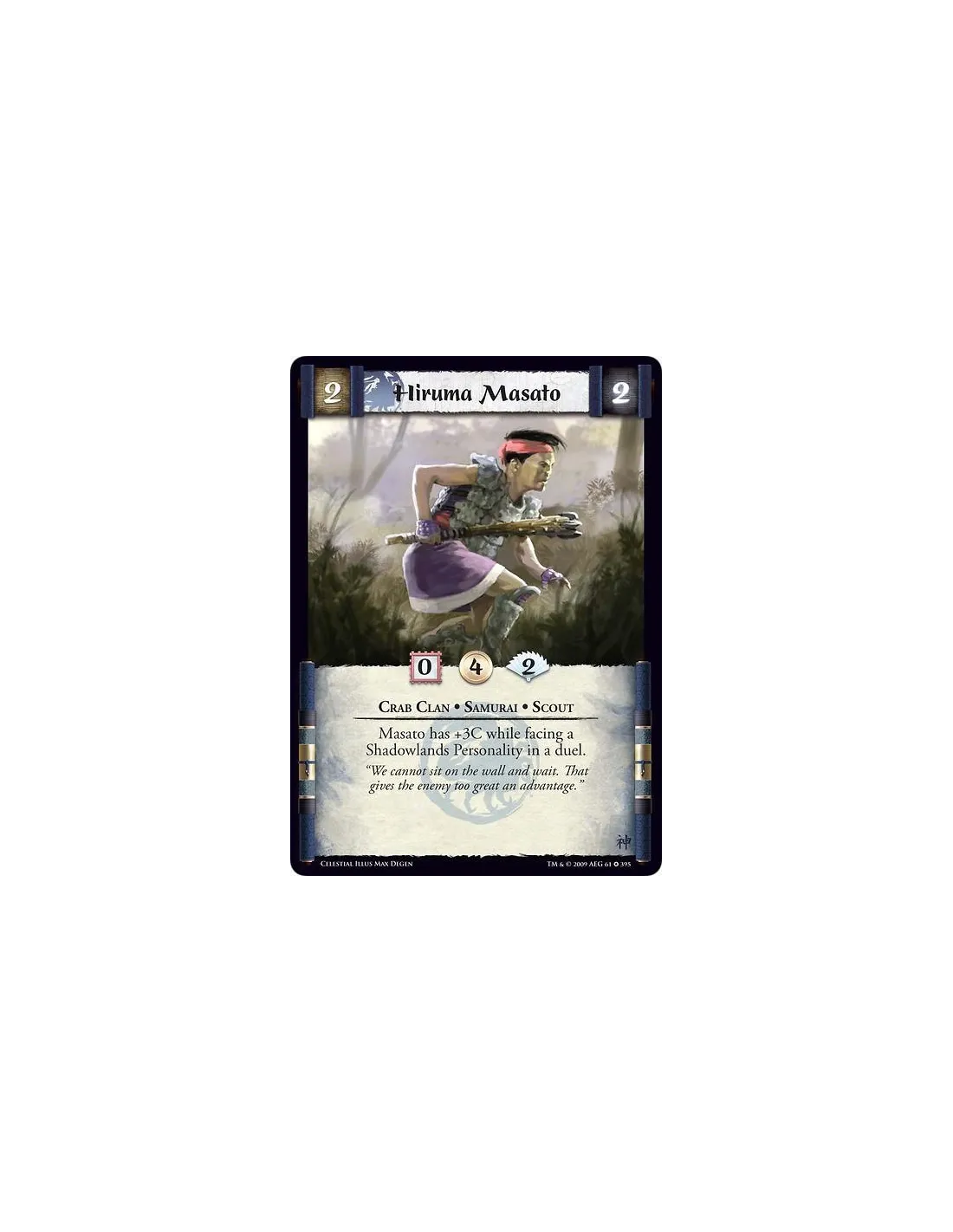Crab Clan • Samurai • Scout Masato has +3C while facing a Shadowlands Personality in a duel.