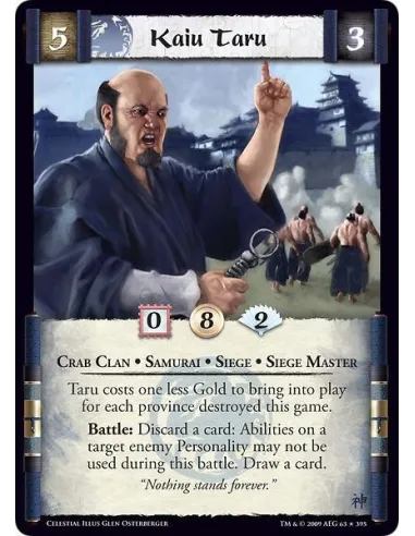 Crab Clan • Samurai • Siege • Siege Master Taru costs one less Gold to bring into play for each province destroyed this game. Battle: Discard a card: Abilities on a target enemy Personality may not be used during this battle. Draw a card.