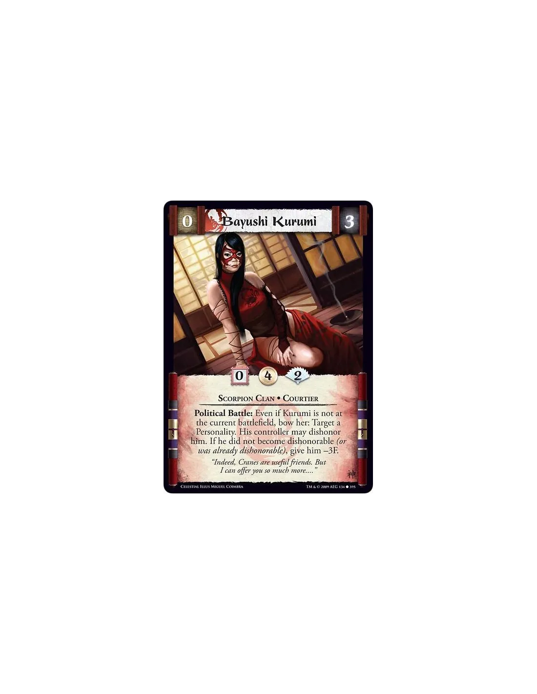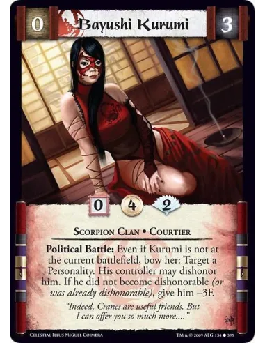 Scorpion Clan • Courtier Political Battle: Even if Kurumi is not at the current battlefield, bow her: Target a Personality. His controller may dishonour him. If he did not become dishonorable (or was already dishonorable), give him -3F.