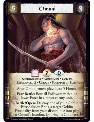 Shadowlands • Nonhuman • Goblin • Experienced 2 • Unique • Sculptor of Flesh After Omoni enters play: Lose 5 Honor. Fear Battle: Bow all Followers with 4 or lower Force in a target enemy unit. Battle/Open: Destroy one of your Goblin Personalities: Bring a target Goblin Personality from your discard pile into play at Omoni’s location, ignoring its Gold cost.