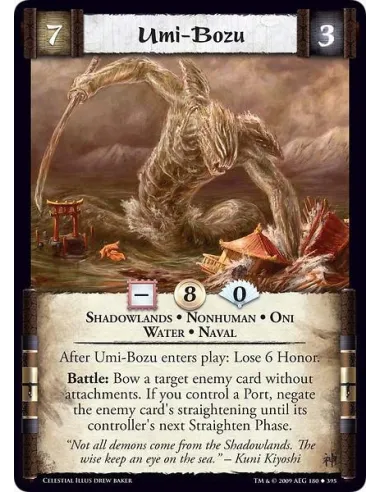 Shadowlands • Nonhuman • Oni • Water • Naval After Umi-Bozu enters play: Lose 6 Honor. Battle: Bow a target enemy card without attachments. If you control a Port, negate the enemy card's straightening until its controller's next Straighten Phase.