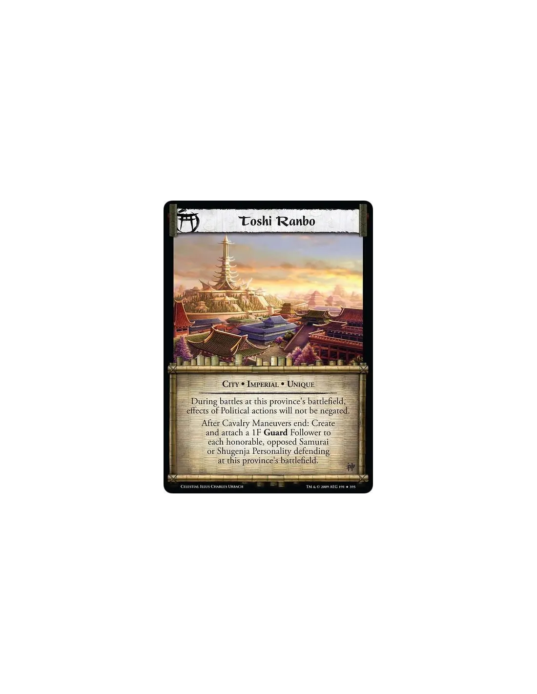 City • Imperial • Unique During battles at this province's battlefield, effects of Political actions will not be negated. After Cavalry Maneuvers end: Create and attach a 1F Guard Follower to each honorable, opposed Samurai or Shugenja Personality defending at this province's battlefield.