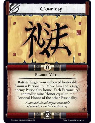 Bushido Virtue Battle: Target your unbowed honorable Samurai Personality: Move him and a target enemy Personality home. Each Personality’s controller gains Honor equal to the Personal Honor of the other Personality.